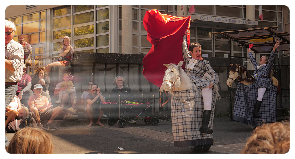 Techniquement, un espace de jeu de 10m par 10m minimum. Un·e régisseu·r·se pour gérer l’enceinte mobile (Soundbox) et l’Ipad pour envoyer les musiques selon la conduite du spectacle.